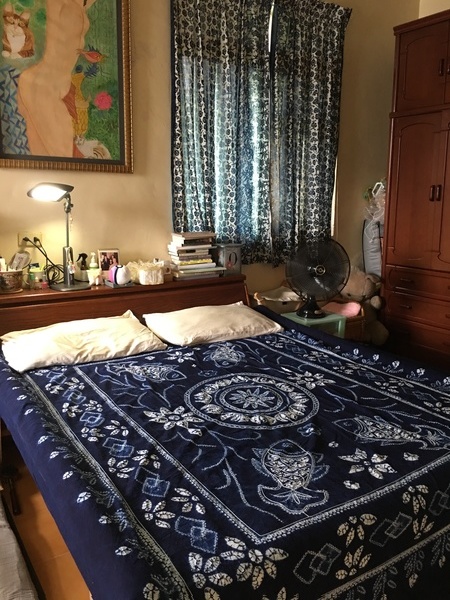 想起之前去大陸旅遊帶回兩大塊藍染布,一塊已懸掛在一樓浴室充當「天花板」,還剩一塊剛好拿來舖在棉被上,和老瞑床挺搭的,也和主臥房的藍染布窗簾相映成趣。