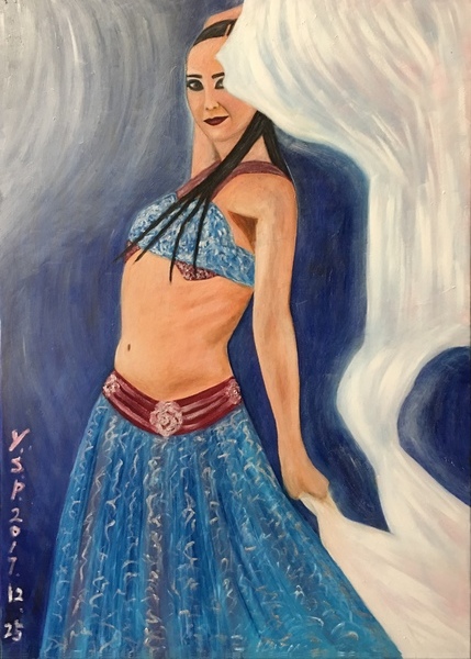 在這幅畫中,揮灑纱巾的舞者側臉回眸一看,帶著淺淺的微笑,眼神、笑容瞬間凍結,成為永恆,這種感覺正是我想表達的。
