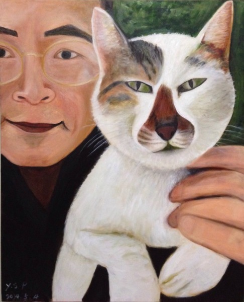 由於主角是貓,我故意把老公的臉咔掉一些。繪畫過程中,主角沒啥意見(也無從有意見),配角倒開口了,說我沒把他似笑非笑的神韻畫出來。我努力觀察,覺得眼睛、鼻子到嘴巴分別看都很像,但湊在一起就是不對。結果仍是比例的問題,鼻子畫太長了,只好刮掉重畫。