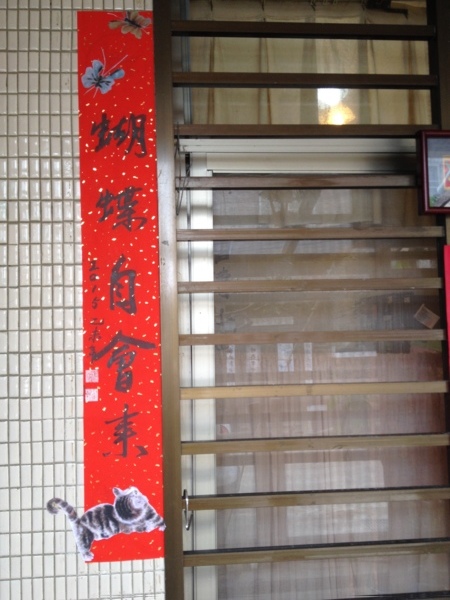 先把上下聯各添加一字,上聯加個「朵」,下聯加個「會」(也曾考慮用「飛」)。接著找到適當的圖案,拍照、列印、剪貼,整個過程就是一堂書法美勞課。