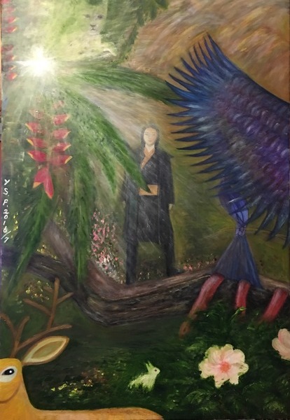 最早是想臨摹海報,然而自我意識融入角色,逐漸產生變化。當我想到我的貓時,孤獨感消失殆半,腦海出現「沒有同類,但有異類」之念,決定加入動植物與聶隱娘為伴,由於個人甚為喜愛運用大量色彩,整幅畫遂變身為繽紛的野生動植園。