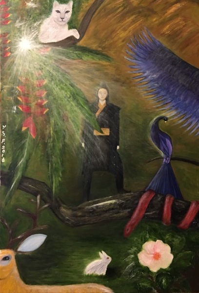 先是電影《阿凡達》裡可供騎乘的巨鳥之五彩羽翅在我心中掃來掃去,接著聯想到《聶隱娘》提及的青鸞。貓科動物必不可少。梅花鹿主要看上那對樹枝狀角。蛇點綴樹幹,白兔生來與之對視。(眼神亦是本畫重點)