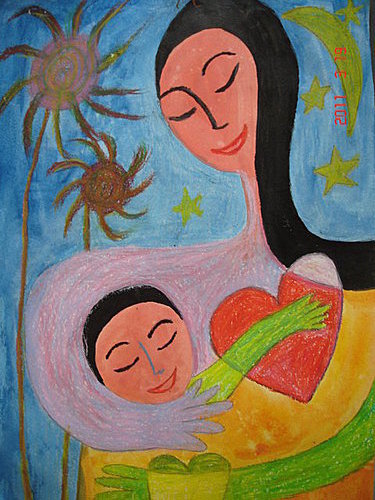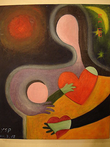 左邊的太陽紅又大,卻不敵右上角散發暈黃光芒的月亮。難道說,我潛意識受了這首歌的影響:母親像月亮一樣,照亮我家門窗…?想必是。因為我還在母親四周加上光環。