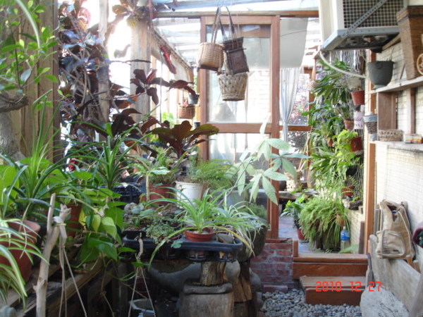 我們在空地上種植物,但因屋朝東北,四處空曠,每到冬天風勢強大,植物都被吹得奄奄一息。為了解決這個困擾,老公決定把前方一半空地以玻璃蓋屋,在裡面栽種畏風的花草;另一半則搭雨棚,緩衝來勢洶洶的風雨。