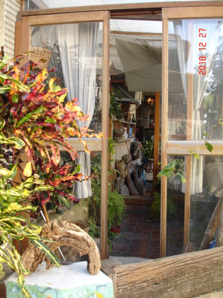 玻璃內側釘上木板,用來擺置盆栽及陶瓷作品。
