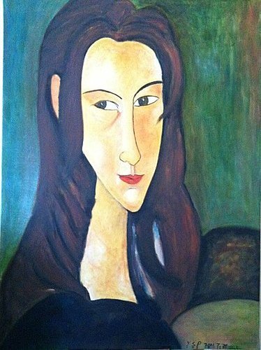 畫完「梵姆登夫人像」後,意猶未盡,想再仿一幅莫迪里亞尼的作品。反覆翻閱他的畫冊,最後挑了這幅「珍妮‧艾比戴妮畫像」。上圖是原作,下圖是仿作。