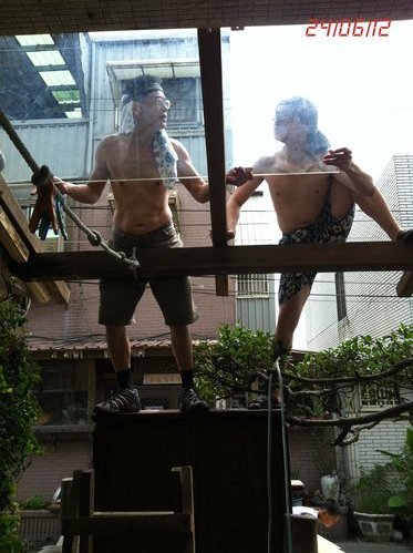 接下來要把大片強化玻璃放上去。這些玻璃是之前同事送的,蓋玻璃屋後還剩一些,也不知平時收在哪裡,反正有需要時,老公就會找出來。玻璃很重(每片32公斤,共需4片),這時就需要幫手了。