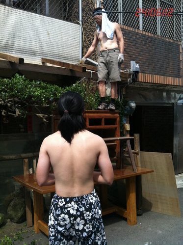 老公把木架上的玻璃一片片取下,再將舊木頭全部拆掉,然後架上新的木頭。到此為止,由他一人獨力完成。