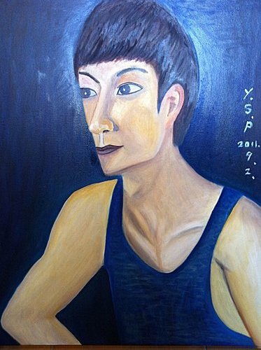 有兩處聽從友人建議加以修改,其一是把喉結畫得比較清楚,其二是嘴角畫得略微上揚,讓畫中人看起來比較不那麼嚴肅。