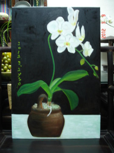 這是一盆單株的白色蝴蝶蘭,姿態優雅,花形飽滿,葉片堅實肥厚;擺放在沉穩的深咖啡色陶甕中,相得益彰;讓我有種按捺不住的衝動,很想把它畫下來。