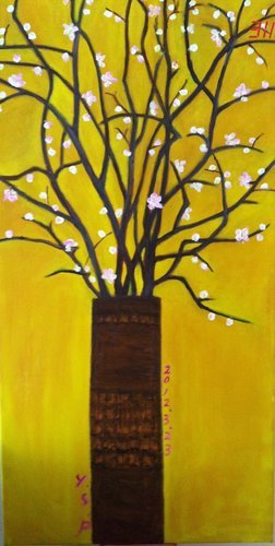 此畫的趣味在於,修長的花器加上繁複的枝幹,令人在視覺上有無限延伸之感;而枝幹上或白或紅的花瓣,則有畫龍點睛的效果。背景所採用的鵝黃色,亮度頗高。幸好光芒沒有蓋過主角,還挺和諧的。