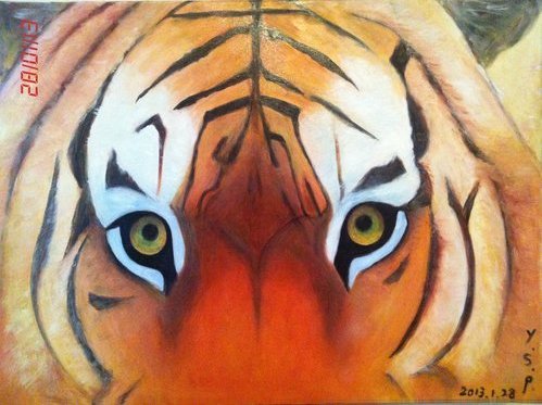 把這幅畫貼在臉書上,引來的回應大致符合預期。有人說「威猛」,有人說「雙眼有神」。但也有出乎意料的評語。有位朋友說:「妳畫的分明就是貓咪的眼睛。」讓我為之一驚,有種被看穿的尷尬 -- 自以為是虎,其實是貓。
