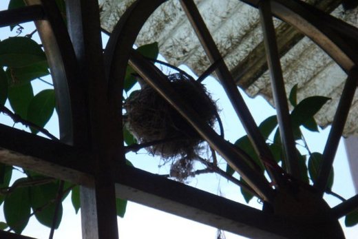 前幾天媽媽在家裏前陽台澆花時突然驚呼「有鳥巢!」,這才乍見一個小小的半圓弧狀的鳥巢竟築在我們住了三十多年的三樓老公寓的小小屋簷下,恰巧卡在一處稍微往外延伸的枝椏及鐵窗欄杆之間。穩固又遮雨,證明了鳥兒的智慧。
