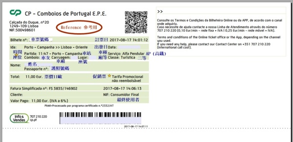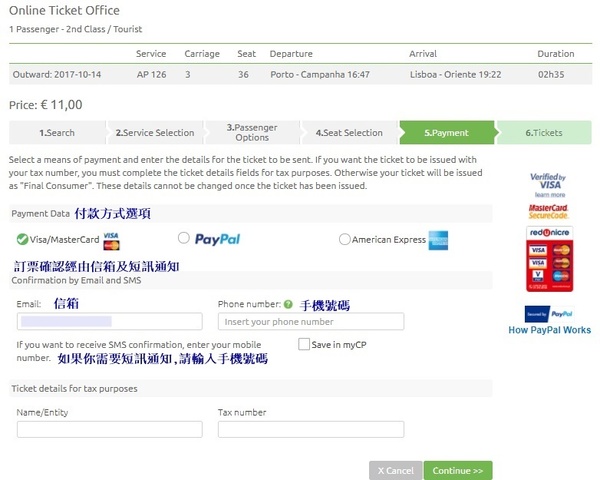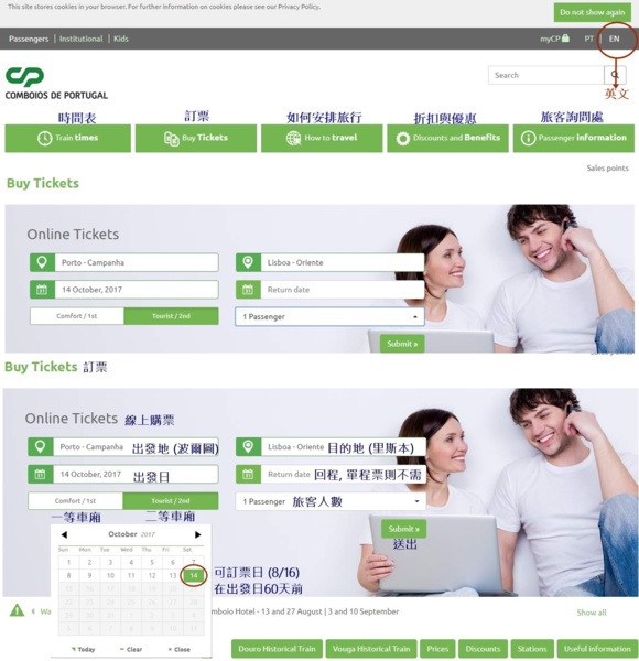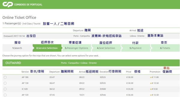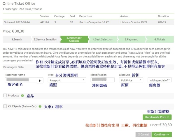 葡萄牙國鐵 CP 訂票步驟説明 (以2017年8月訂購10月出發的票供參考)