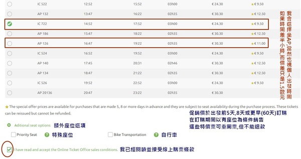 選好想搭乘的車次,如果AP與IC價差不多可選AP,只要多1.5歐就可提早30分鐘抵達目的地。