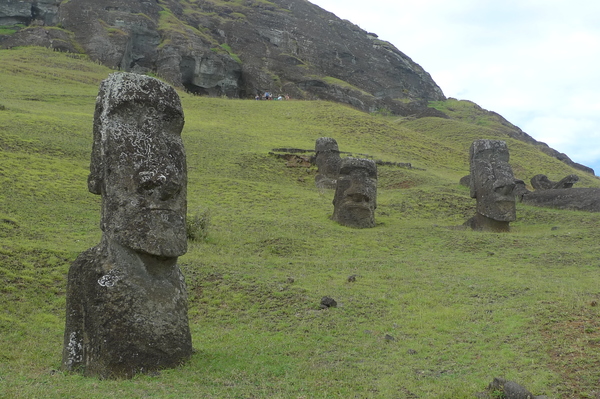 復活節島上 8百多尊被稱為【摩艾】(Moai)的巨型石像,每一尊都是由原塊大石雕鑿而成,石材取自島上的主要採石場 Rano Raraku,聽說在採石場仍可見到 3百多尊未完成的石像。