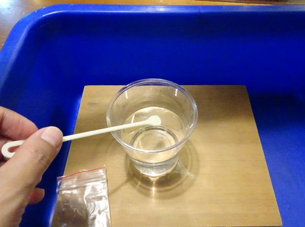 首先,要把鹽倒入杯中攪拌製造滷水。