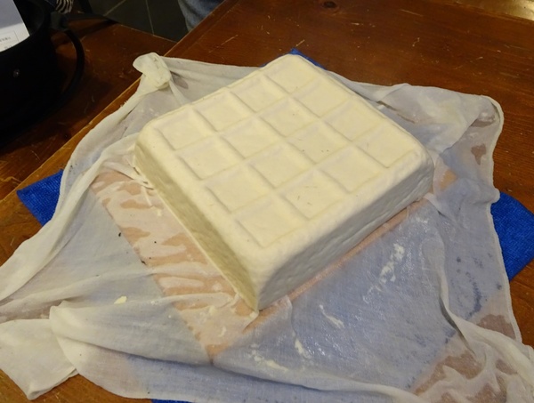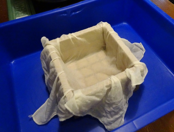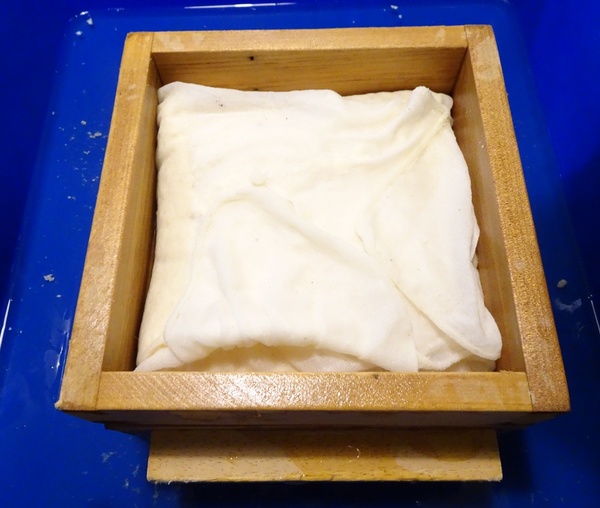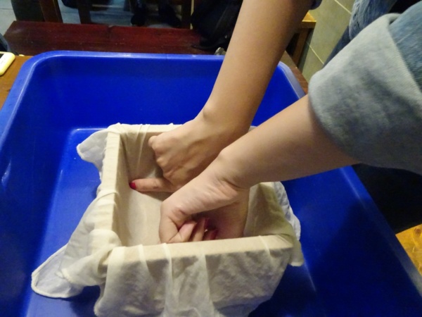 這時剛剛靜止的豆漿已成豆花(更像蛋花湯的樣子),就可放入木格內。