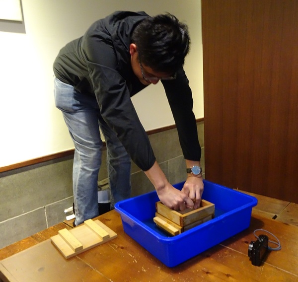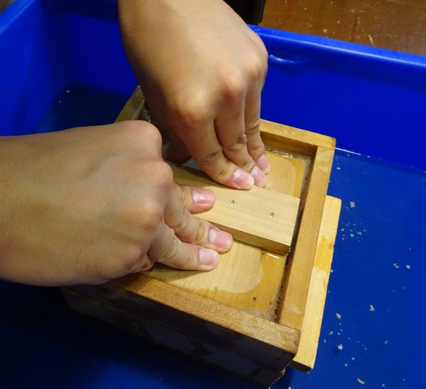 都平整的摺好後,再放上一個空心四方盒,以便放上木盒蓋之後釋水。
