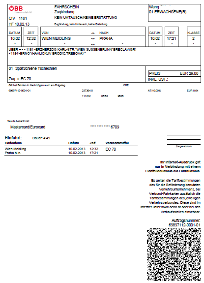 另一段從維也納出發布拉格的國鐵票,歐飛自己上奧地利國鐵訂到最低價EUR29/人。