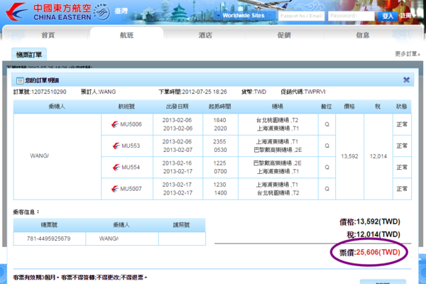 我要出發的日期為中國農曆過年假期,想當然而,一定得提早6個月就要盯著票價囉~所以歐飛與蘇就在2012年7月就很瀟灑地滑鼠一按~旅程在半年後就即將展開 XDDD