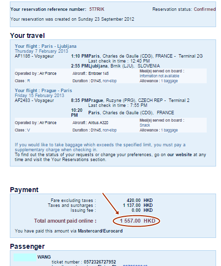 看到下面的電子機票行程表有沒有發現我是用港幣訂票呢?歐非也不知道為什麼,總是想要用各種方法來買到較便宜的票價XD 原先發現用UK法航網站的票價算便宜,那知到最後要刷卡付款時,突然出現了刷卡手續費(好像要5磅忘了耶)~呃 有點受騙的感覺~於是再試著查HK法航網站,不需要刷卡手續費,總價HKD1557. (來回票價:NTD5990) 更便宜了:D