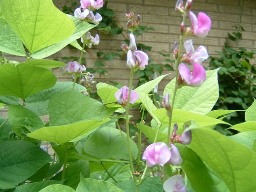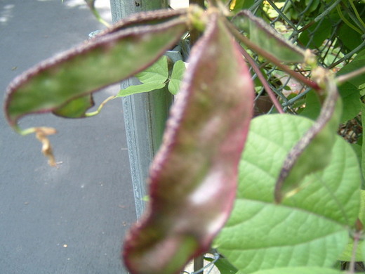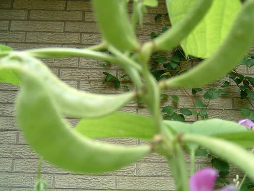 沒幾天豆子就發芽,長葉,很快的長到一公尺時,我幫它們搭了架子。後來不夠它們爬,乾脆拖到前院讓它們爬籬笆,葉子綠油油看起來精神飽滿。