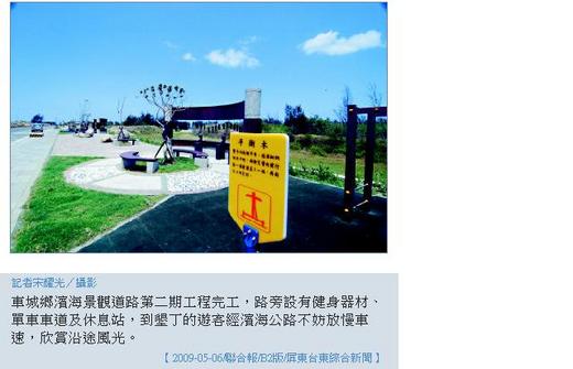 屏東縣車城鄉濱海景觀道路二期工程已經完工。 車城鄉長林顯水建議要到墾丁的遊客,路過車城時不妨繞道濱海景觀道路,可沿途欣賞大海美景,一邊還可遠眺青山。 車城鄉濱海景觀道路從海口港進入,沿路肩新闢有腳踏車專用道,途中若想親近大海,可把單車鎖在路旁,下海看潮間帶豐富的海洋生物。 林顯水說,濱海公路全長5.3公里,從海口港到海生館,第一、二期工程從海口港六福莊泡湯度假飯店起經金砂崙砂丘、黃金海岸到福安宮後方海邊,全長2.3公里,除了腳踏車專用道外,還有休息站、沖腳池、健身器材等。 濱海景觀道路,路寬25公尺,包括土地補償費、工程費等共9億多,最艱難的工程是穿越四重溪及保力溪兩條溪,行政院經建會規劃建拱型景觀大橋,工程費超過2億,今年底發包施工,預定民國101年完工。 目前進行第三期工程,即從福安宮後方到四重溪堤防,全長500公尺,預定下月完工。配合景觀大橋興建,目前水利署已著手建四重溪河堤,完工後可從四重溪出海口騎腳踏車到四重溪溫泉區泡湯,四重溪並有即將啟用的溫泉泡腳池,全程約5公里。 濱海景觀道路,從海口進入前半段是木麻黃防風林,後半段是海灘,白天可欣賞蔚藍大海,聽海濤拍岸,傍晚看日落晚霞,晚上賞星。 【2009-05-06/聯合報/B2版/屏東台東綜合新聞】 |