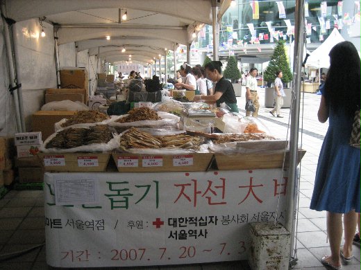 上星期開始共要舉辦十二天的是「照顧獨居孤苦老人募款商品特賣會」,由LOTTE MART首爾車站店主辦,協辦的是韓國紅十字會和首爾火車站。正好去車站接朋友,既然恭逢其盛,當然要參觀一下。