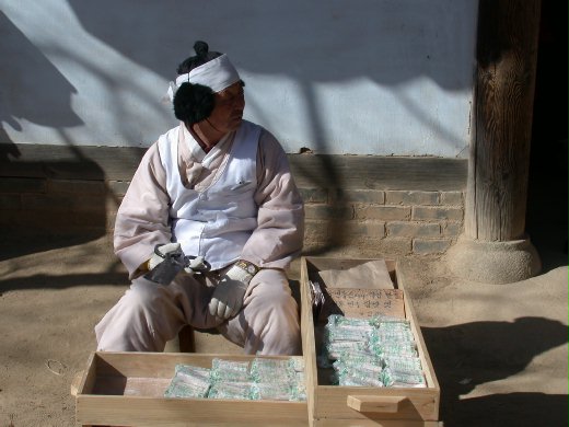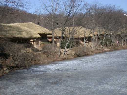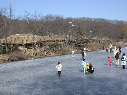 水源民俗村是韓國相當值得一遊的景點,除了展現傳統建築,民藝和習俗外,隨著季節更替,四季也擁有不同的風情。隆冬季節,連小溪都凍結了,但旅人的遊興卻不減,大人孩子在冰上樂翻天。蹲坐路邊賣麥芽糖的小販,當然也是景觀中的一環,雖敬業的堅守崗位,只是......唉,真冷啊。