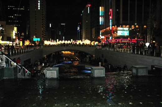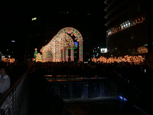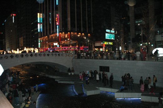 清溪川水光輝映燈光,雖然極冷,大家都全身重裝備還是難敵寒意,卻仍人氣沸騰,笑語喧天。零下12度低溫,本應結冰的小溪,依然水聲淙淙川流不息,只因水流特別湍急,就算溫度持續降低,清溪川也不會結冰。