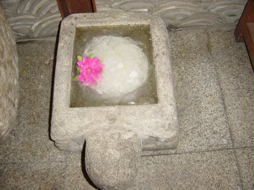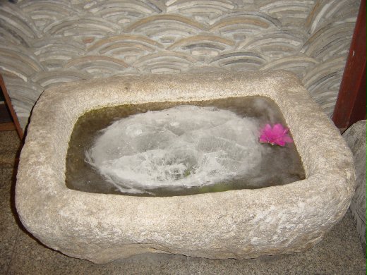 雖然已入春,但氣溫卻持續偏低,路邊餐廳前裝飾用的石缸、石龜,滿貯清水依然凍結,襯托之下連漂浮的塑膠紅蓮花,似乎也憑空增添了幾分冰肌玉骨的風采。