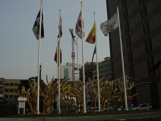 溫度越降越低,路邊景觀也在不知不覺中改變,四周的大樹小樹,似乎一夜之間都穿上了小肚兜或大外套。乾稻草編得整整齊齊,圍在大樹腰身中間或乾脆包得密不透風。路邊花壇,都用稻草編成鋪蓆或大罩子,蓋在花床上。最特別的是,綿延彎曲抓牢石牆攀生的爬牆虎,每一根粗大藤條,也被細心加上合身護套。韓國各地方政府為了保護植物安度寒冬,的確是煞費苦心。