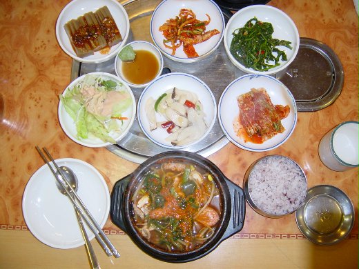 按照韓國食堂的慣例,小菜和飯同時先送上桌,羅列的一碟碟小菜,真是漂亮得令人嘆為觀止。六樣小菜,除了必備的韓國泡菜及生菜沙拉、燙青菜外,還有些特別菜色像炒蕈菇、橡實凍,至於用章魚加桔梗涼拌,口味互補更是別出心裁。因主食是海鮮湯,還細心的準備了芥末。盛在不銹鋼碗裡的白米飯加有紅豆,青紅皂白黃五色繽紛,調理得非常用心。