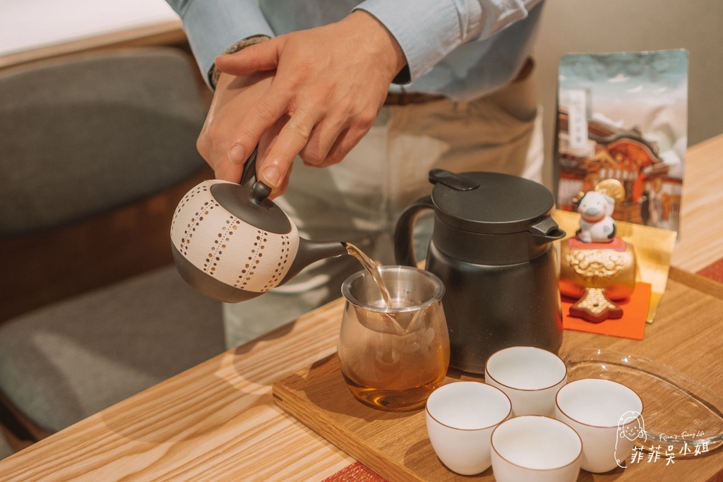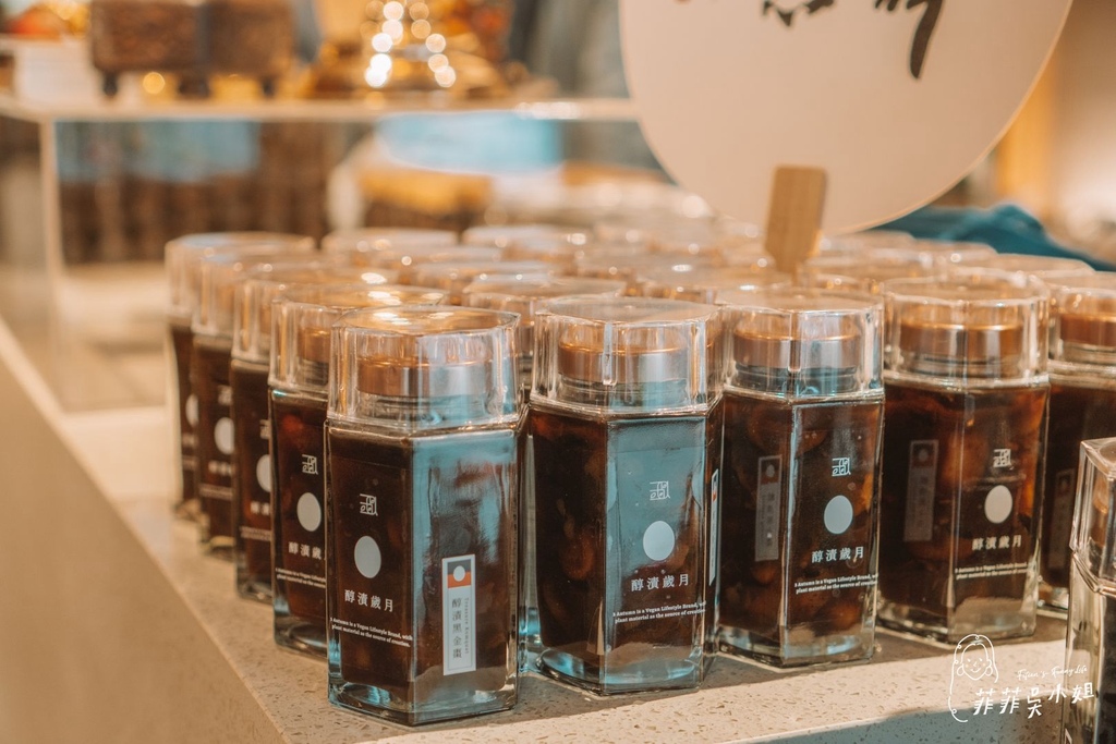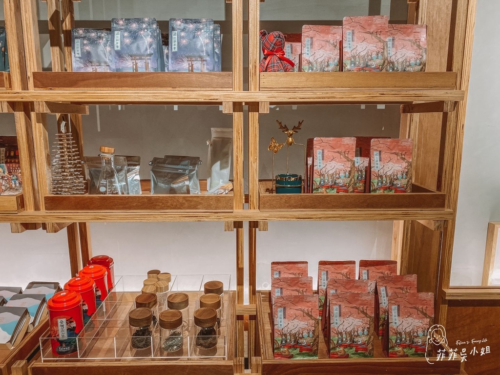 入店後可見架上擺放許多精緻伴手禮,有蜜餞、茶葉、鳳梨酥…等,原來店主是擁有70年歷史蜜餞行第三代,本業茶葉主要外銷到日本,所以這裡最原始的用途是給國內外客戶展示商品的show room,由於疫情影響許多客戶來進不了台灣,便與好友合議,將三萩茶會轉型為預約制招待所型式,在這裡可以享食、品茗、選購各式精緻伴手禮。