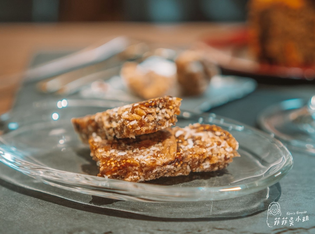 以金棗果乾製的經典水果條,基本上果乾要做成和其他物料搭配出相得益彰的甜點比較有難度,所以全靠主廚的經驗試出口感出色合適的夥伴,像是堅果、椰子粉…等,吃得到金棗的酸甜味道,咀嚼起來有點像牛軋糖的口感,配茶很適合。