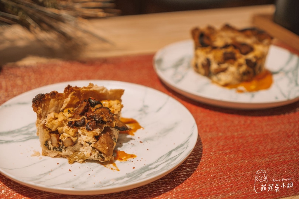 法式蕈菇鹹派,同樣沒有使用蛋奶類,以豆漿優格替代,這道我也很喜歡,內餡軟綿,外皮酥脆,每一口都吃得到菇類的濃郁香氣卻不奶膩。
