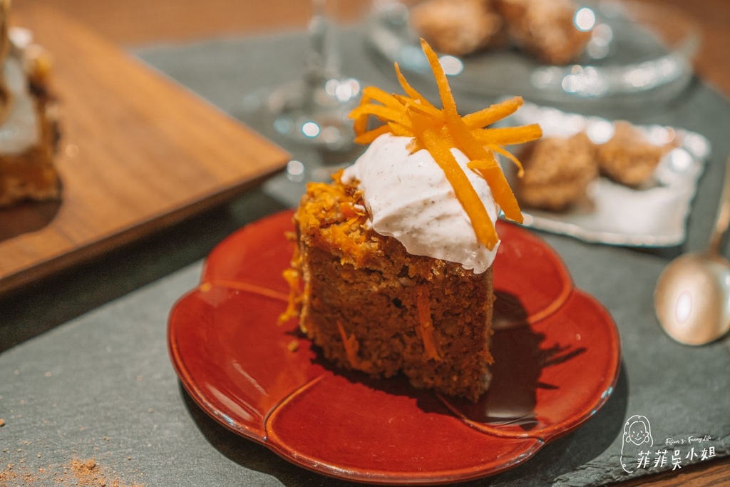紅蘿蔔蛋糕,以紅蘿蔔、核桃、肉豆蔻佐以帶點微鹹起司奶醬,吃起來有濃濃的肉桂香,鹹甜交錯的口感很特別。