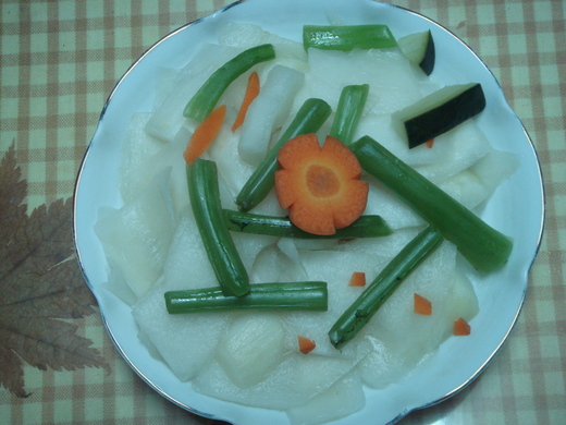我用的是最簡單的方法.把蘿蔔切長條.甚至是燉湯削下的厚蘿蔔皮和蘿蔔纓.都拿來抓鹽搓揉放一個晚上.隔天用冷開水洗過.再加高粱醋和糖.放置三、四天就可以食用了.吃來酸酸甜甜.可下飯可配酒.