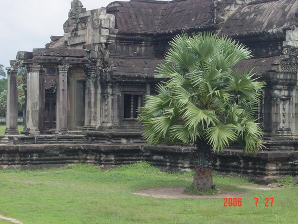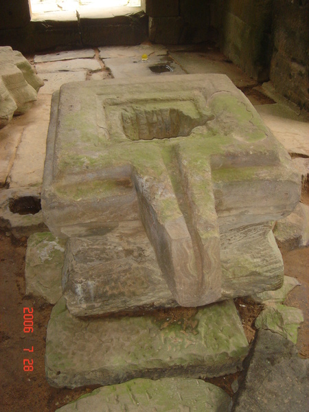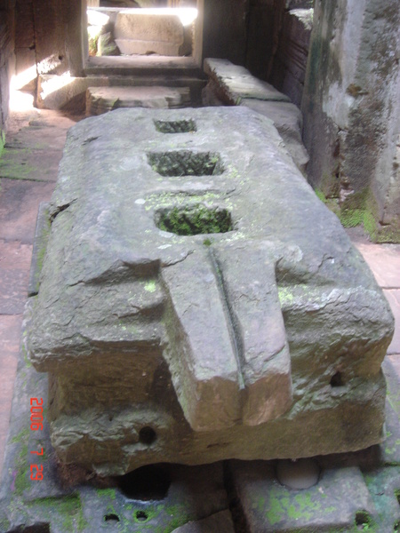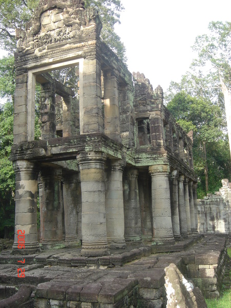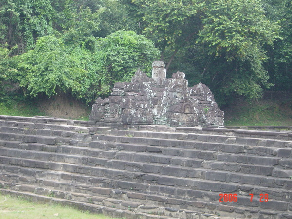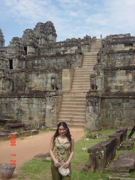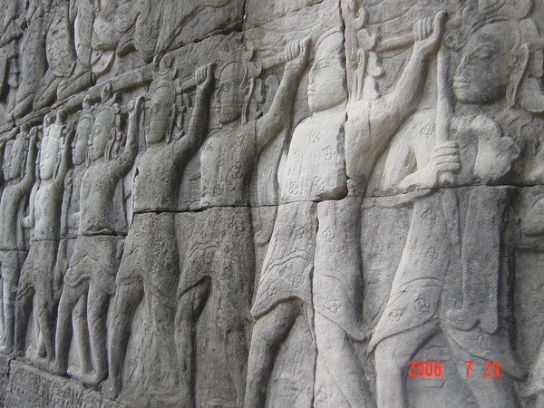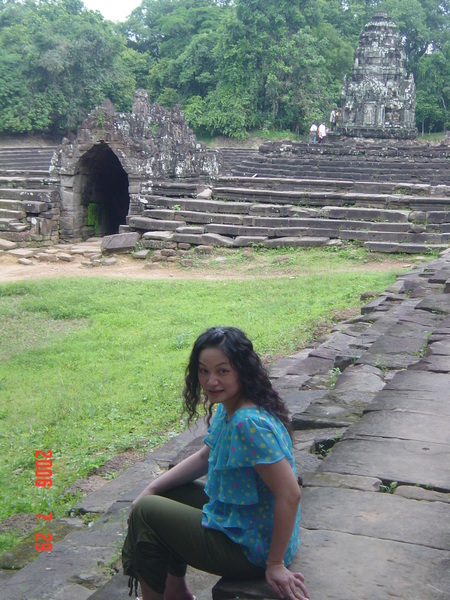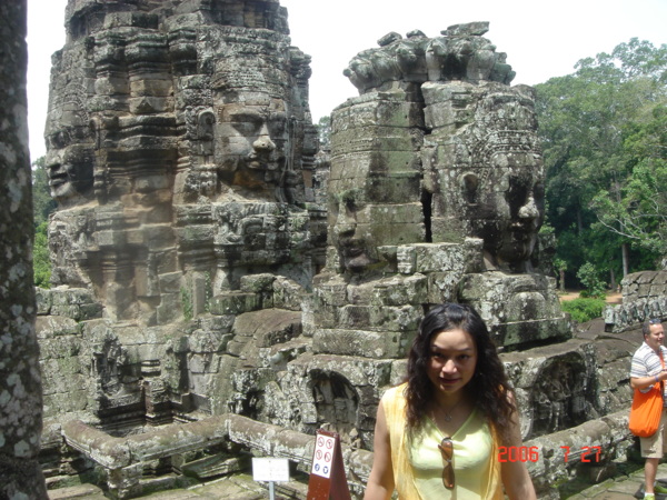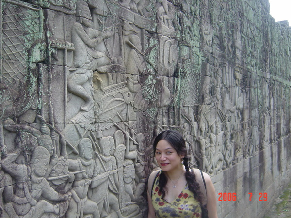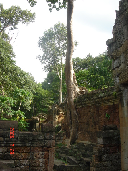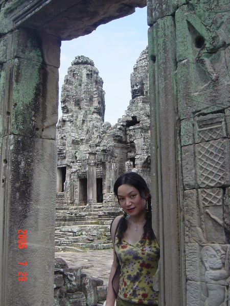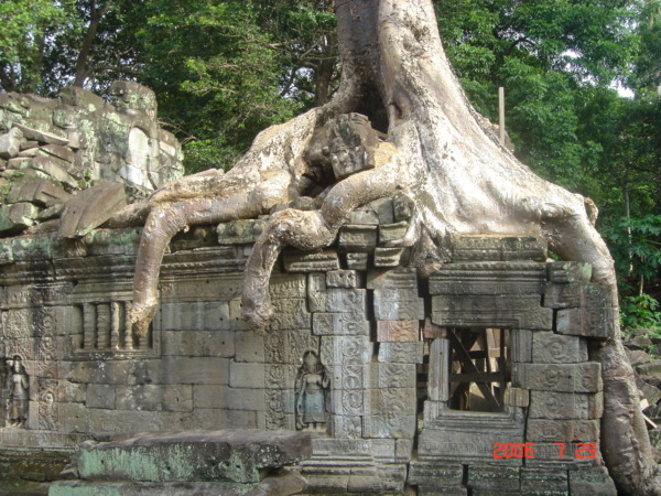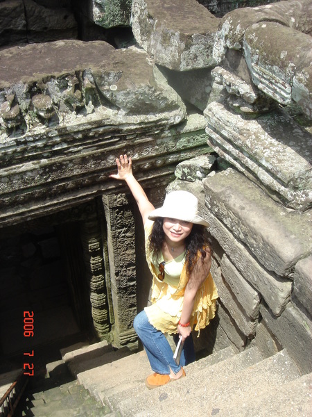 我走在小吳哥城中,想像著在一百四十六年前有一群人興奮地拿著砍刀,不斷地朝著周圍叢林揮舞著,他們越往叢林深處前進,情緒更是澎湃。而當他們無奈地想要放棄,丟下砍刀準備折返時,卻聽到砍刀碰撞到堅硬物所發出的聲響,當時,想必心中的震撼更盛於現在可以登堂入室的我有千倍萬倍吧!當時的門柱定是東倒西歪的、斷裂倒塌的門樑和佛塔、被藤蔓和亂葉糾纏著的巨石,還有巨石上的文字與圖案、塔上精緻的雕刻,這些斑駁無言的石垣殘跡,在被發現的瞬間,必然有被探險者的大聲歡呼給驚擾吧!