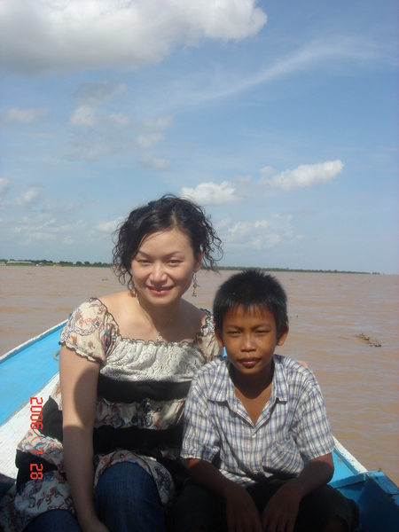 才準備上船遊覽東南亞面積最大的淡水湖,一個瘦小黝黑的小男孩招呼著我們,並用標準的中文對我們說:「小心頭!」這個九歲的小男孩幫忙開船的父親拿著巨大的槳把船移出碼頭,感覺力大無比,我們對他豎起大拇指,他靦腆地笑。