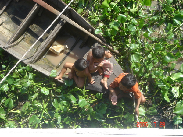 在船靠近水上餐廳時,我們已經見到兩、三艘小船上有幾個年齡不一的小孩,有的身上一絲不掛,有的僅著下衣,他們伸出小手向觀光客招手乞討,也有母親抱著襁褓中的嬰孩,甚至有個小孩窩在一個黑色的澡盆中,手裡拿著一根小木棒向觀光客划過來乞討。