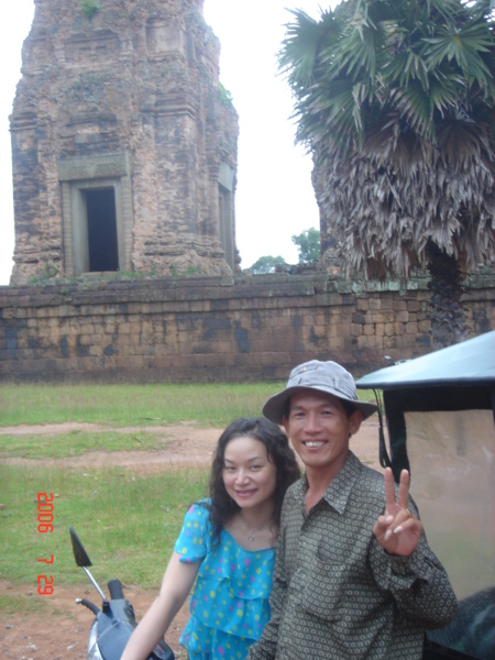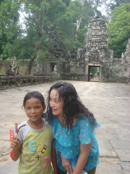 還有一個希望,出現在往巴肯山的山路上,第一天因為下雨,已經錯失巴肯山的落日,但總不能錯過山上的美景,於是我們往山上爬去,因緣際會跟著一群要到山上野餐的孩子走,這一群孩子,人手一個塑膠袋,袋子裡可以見到一瓶水和一大團白飯。我 對著走在隊伍最後的三個小男孩打招呼說“Hi !"其中一個主動問 我們從哪裡來的?然後介紹自己,“I come from Cambodia."“I am fourteen years old."還問我們是作什麼工作的?什麼時候回臺灣? 到了山上,這群孩子在古蹟前玩遊戲,歡笑陣陣,我拿起相機和他們拍照,並錄下影片,他們見到自己在影片中,興奮不已。