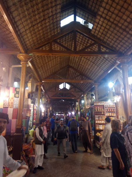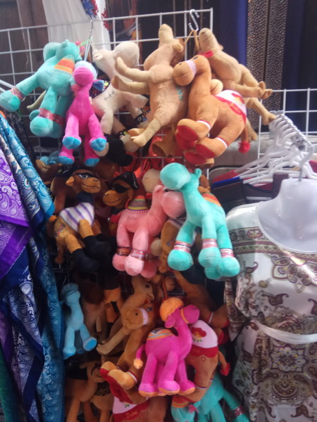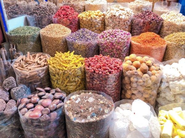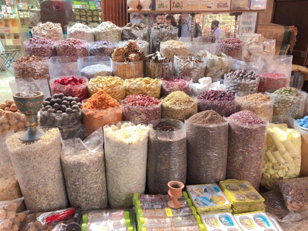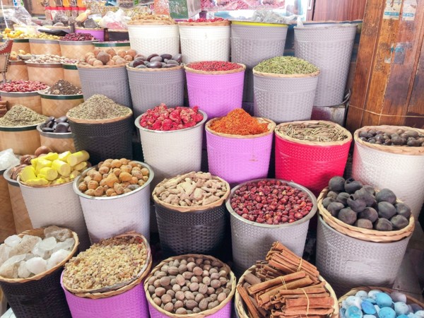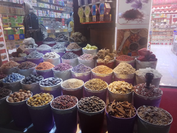 這裡的商家拿出各種攬客的招數,先是語言問候──「你好」、「你好漂亮」已經不稀奇,連「新年快樂」都出爐了;有的甚至把紡織品布料在你路過時就直接套在你脖子上,然後就走進店家,有的人只好跟著進去把布料還給他,就增加了購買的機會。我們對購物沒興趣,我則是直接拿下來跟老闆道謝後,迅速放在他店外的攤架上離去。我對欣賞琳瑯滿目的乾果和色彩斑斕的香料,比較有興趣,拍照起來眼花撩亂,也覺光彩奪目。