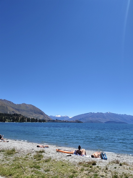 遠處雪山靜臥,岸邊人們懶懶地曬著太陽,