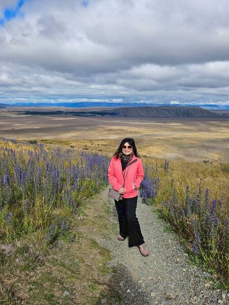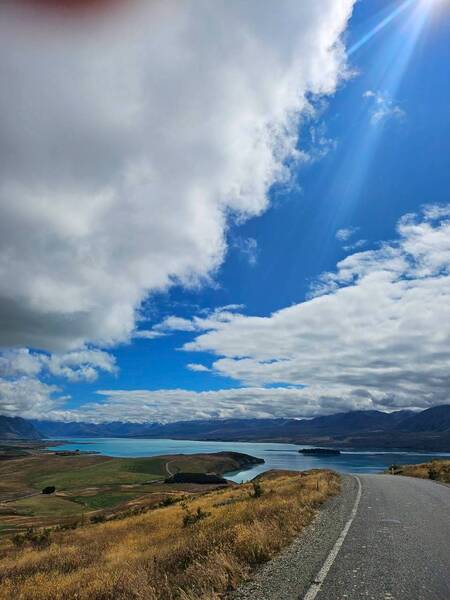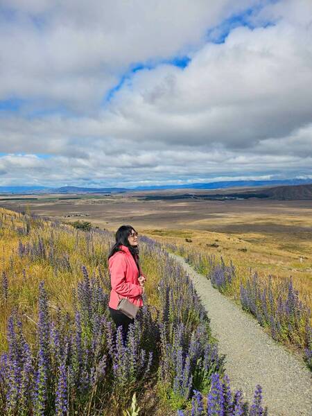 而最讓人驚喜的,是沿途盛開的魯冰花。一簇簇、一片片,成串地往上開,在風中輕輕搖曳。或是單獨綻放在路邊,或是與草原、群山相互襯托,構成了一幅幅絕美的畫面。這些來自地中海的花朵,在紐西蘭的鄉野間紮根,為這片土地增添了一抹絢麗的色彩。