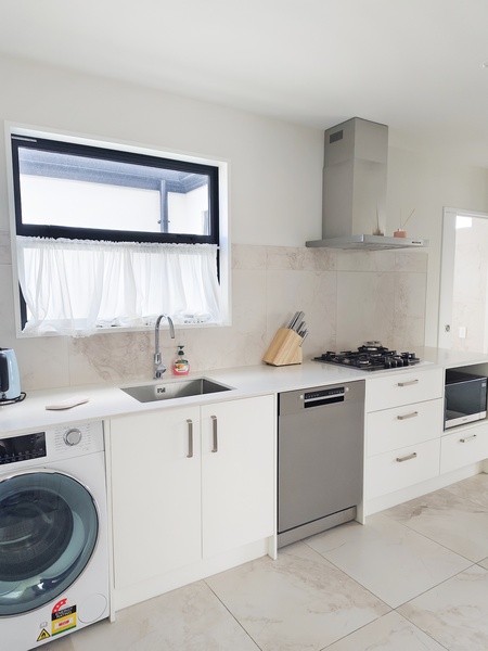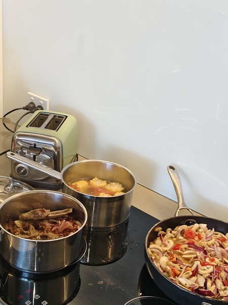 民宿的空間藏著不動聲色的詩意。挑高的客廳以原木與白牆為底,大面積落地窗將窗外的湖光山色框成流動的畫作:開放式的廚房讓我有了香煎骰子牛肉的心情。