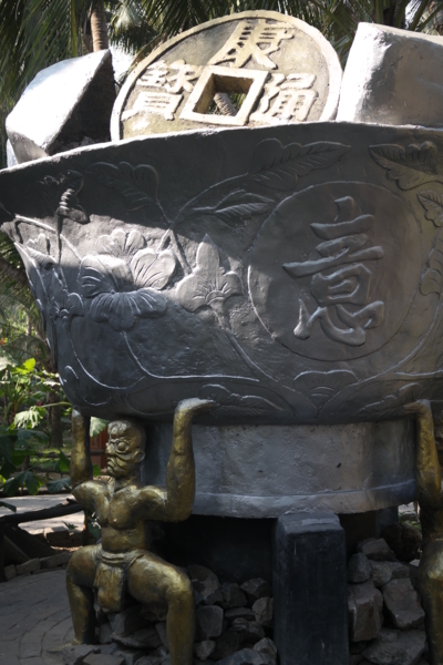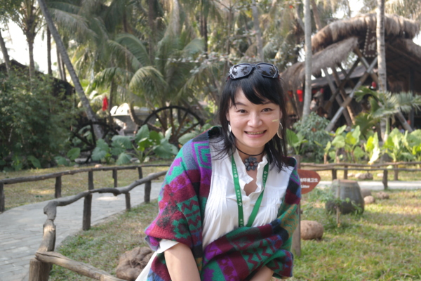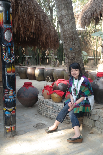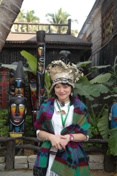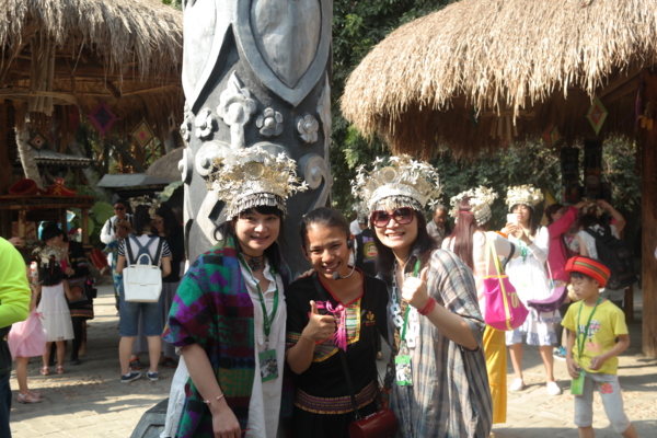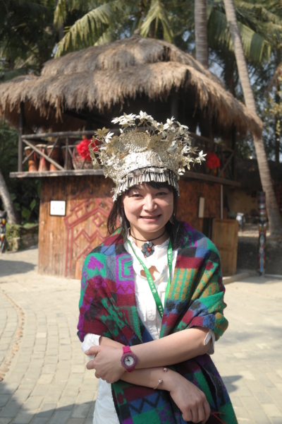 景區裡提供苗族銀帽供遊客免費戴著拍照。