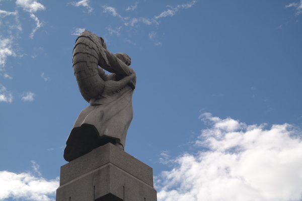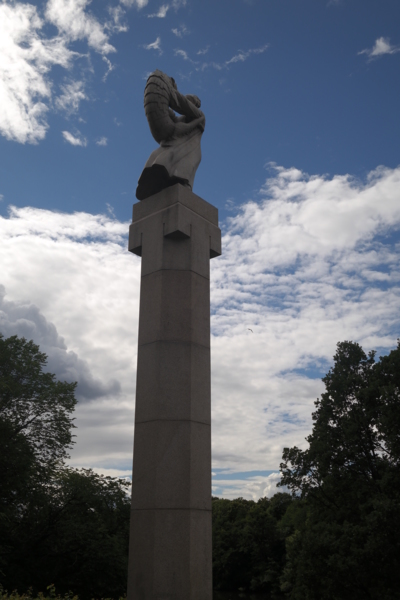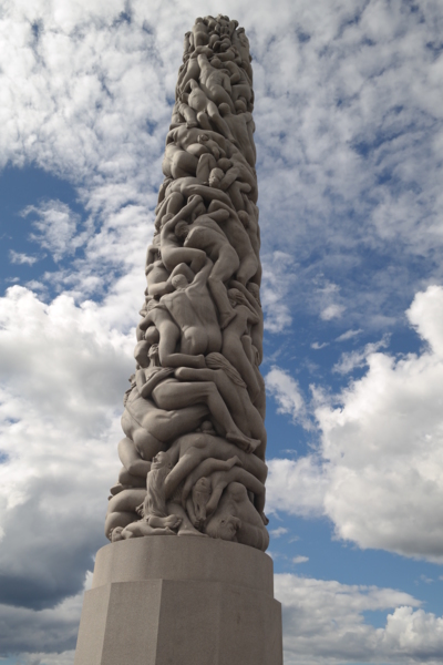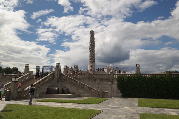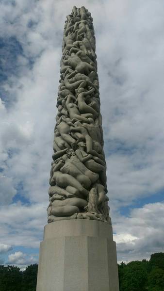 人生柱 (monoliten) 」,雖位於公園後方,但一入公園門口,就可見它高高擎向天空而立。往公園後面走,更能清楚見到由整塊白色花崗石雕刻而成的「人生柱」,這個高