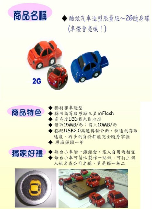 今天朋友傳了一個網頁給我看,原來是他們公司製造的車子造型的隨身碟,可愛的外型,還有可以刻上名字的服務,讓人覺得非常的心動,呵呵,我想很多衝動都是由心動開始的,雖然車子是男生比較愛的款式,不過他的價格與外型,我倒真的覺得是物超所值!有需要的隨身硬碟的朋友們,可以考慮看看喔!^^